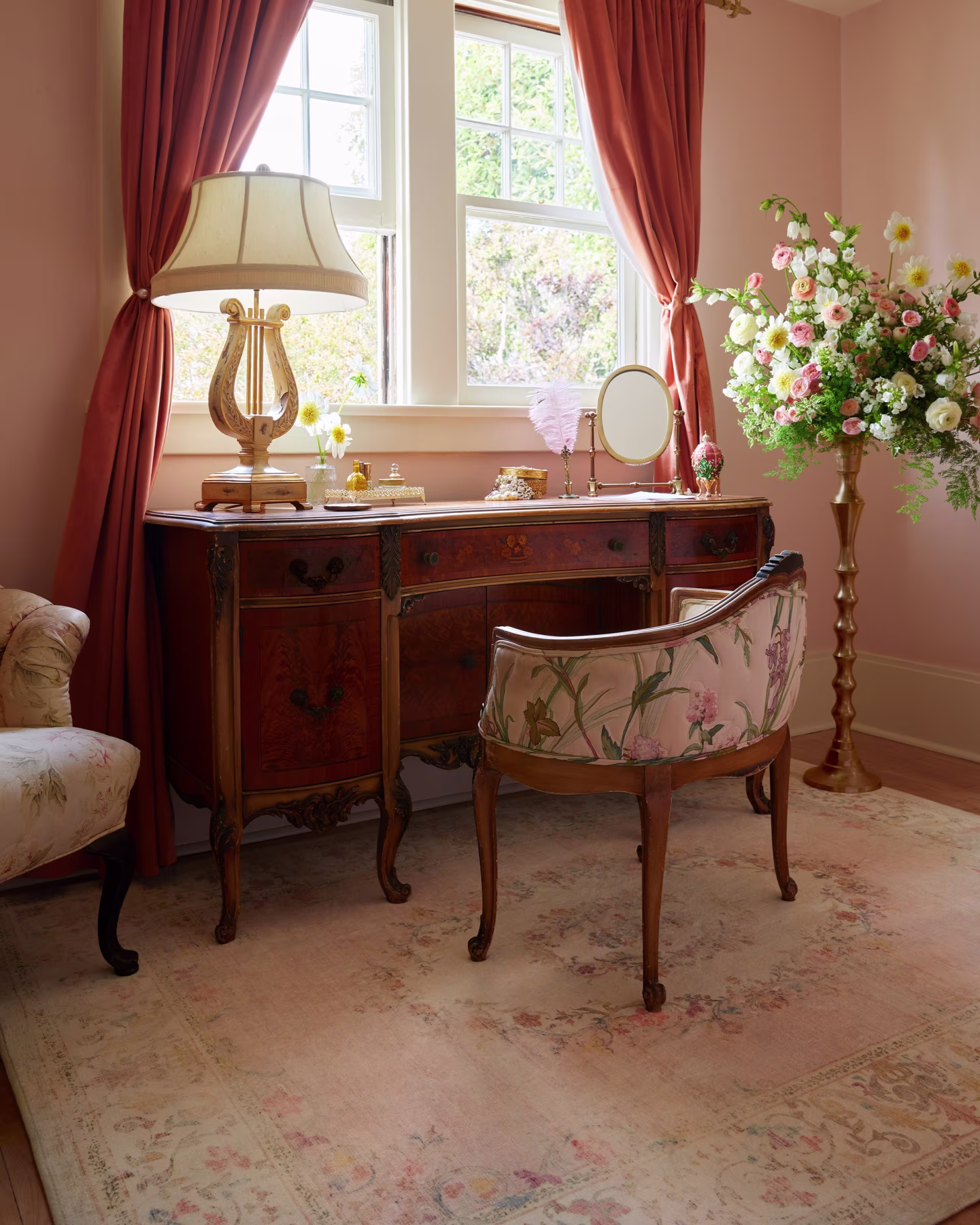 Experience the allure of the Regency era in style with Bridgerton Lady Whistledown Vintage Pink Rug from Global Rugs category. Its elaborate pattern and retro pink color recall the glitz of ballrooms and whispered secrets. This rug subtly brings a sense of classic elegance to any area with its plush underfoot and low care requirements.